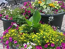 Indoor plants can thrive in many areas in a variety of containers.[24] Hanging plants are an excellent option if space is particularly scarce. When hanging plants it is important to make sure that the structure can support the weight of the plant when it is fully watered.[25] Watering hanging plants can be done easily with a step stool and a long neck watering can.[25] Plastic pots are one of the least expensive options but ceramic pots have shown to be a favorite among indoor gardeners.[26] Whatever the container, is it important to make sure that there is adequate drainage.[27] Water indoor plants with lukewarm water and be careful not to over water them. The soil should be fully hydrated, but not soaking.[28] When choosing which plants to include in the garden, there are several factors which should be considered. The growing conditions of the plant should be consistent with the conditions where the plant will be kept. The amount of upkeep required by the plant is also important. Gardeners with little time may want to choose plants that don't require a lot of attention while more gardeners who plan on devoting more time to the garden should choose plants that are more meticulous. Finally, the amount of money devoted to the project should also be specified. Some plants require more financial support than others.