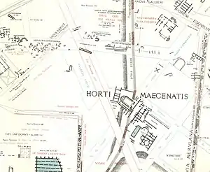 The Gardens of Maecenas, or Horti Maecenatis, constituted the luxurious ancient Roman estate of Gaius Maecenas, an Augustan-era imperial advisor and patron of the arts. The property was among the first in Italy to emulate the style of Persian gardens.[1] The walled villa, buildings, and gardens were located on the Esquiline Hill, atop the agger of the Servian Wall and its adjoining necropolis, as well as near the horti Lamiani.