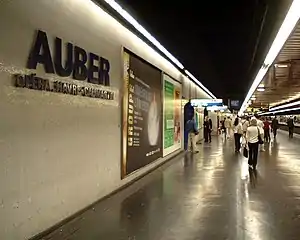 Auber (French pronunciation: [obɛːʁ]) is a station on RER A in Paris. Opened on 23 November 1971 and inaugurated during a ceremony by singers Dalida and Adamo, it is one of the largest vaulted underground stations in the world.