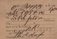 - "1881-1898 Coaching". Midland Railway Operating, Traffic and Coaching Depts: 66. 1881. Retrieved 12 April 2021.