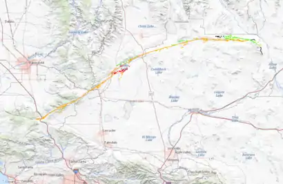 The last significant ruptures on the Garlock were thought to be in the years 1050 AD and 1500 AD. Research has pinned the interval between significant ruptures on the Garlock as being anywhere between 200 and 3,000 years, depending on the segment of the fault.[4] The most recent notable event in the Garlock Fault Zone was a magnitude 5.7 near the town of Mojave on July 11, 1992.[5] It is thought to have been triggered by the Landers earthquake, just two weeks earlier.[5] However, no surface slippage of the fault itself had been recorded in modern times until 2019. Following a series of earthquakes on nearby minor faults in late July 2019, the Garlock Fault was observed moving about 2 cm (0.8 in)[6] between July and October accompanied by numerous minor earthquakes, a state known as fault creep, and producing a bulge in land observed by satellite radar images.[6][7][8]