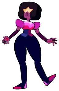 Garnet is a fictional character from the animated series Steven Universe, created by Rebecca Sugar. She is a Gem, a fictional alien being that exists as a magical gemstone projecting a holographic body. Garnet is a fusion — i.e., two Gems combining personalities and appearances as one shared holographic body — formed by two Gems named Ruby and Sapphire, who choose to remain permanently fused out of love for each other.