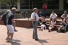 Birdsong was issued a trespass warning that prohibited him from entering The Pit for two years. Following the incident, he returned to preach, initially in front of Davis Library, about 100 feet from The Pit, and later about 200 feet away, in front of Wilson Library on Polk Place, which he referred to as "the Homo Zone."[4] During this dislocation, he was sometimes referred to as the "adjacent to the Pit preacher".[6] In March 2009, Gary's two year banishment from The Pit expired and he once again returned to preach in The Pit. Some students were glad to see him return to this popular spot after his extended absence,[7] but the overall reaction was mixed.[6] Some disagree with his beliefs but feel he has a right to be there. Others just find him entertaining.[4]