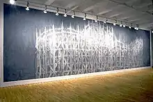 Simmons received his BFA from the School of Visual Arts in 1988. He received his MFA from CalArts in 1990 and received both the National Endowment for the Arts Interarts Grant and the Penny McCall Foundation Grant shortly after.[1] Shortly after his graduate studies, Simmons found a studio back home at a former vocational school in Manhattan, New York. His space was empty but for several old-fashioned, wooden, rolling classroom chalkboards, which he began using as canvases in a series of early works about mis-education and conceptions of racial and class identity. Interested in the medium's ambiguous and impermanent nature, he worked with chalk on boards or on walls painted with chalkboard paint almost exclusively in the 1990s. In these works, he often borrowed imagery from antique cartoons that depicted black caricatures. In a wall drawing called Wall of Eyes, commissioned for the 1993 Whitney Biennial, the black surface of board is peppered with bodiless cartoon eyes of different sizes.[2]