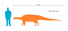 Gastonia was a medium-sized ankylosaur. In 1998, Kirkland estimated its length at six metres.[2] In 2010, Gregory S. Paul indicated a body length of five metres and a weight of 1.9 tonnes.[8] The skeleton mount is 459 centimetres long with a hip height of 112 centimetres.[7]