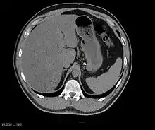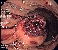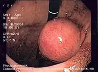 As the tumor grows it may project outside the bowel (exophytic growth) and/or inside the bowel (intraluminal growth), but they most commonly grow exophytically such that the bulk of the tumor projects into the abdominal cavity. If the tumor outstrips its blood supply, it can necrose internally, creating a central fluid-filled cavity with bleeding and cavitations that can eventually ulcerate and communicate into the lumen of the bowel. In that case, barium swallow may show an air, air-fluid levels or oral contrast media accumulation within these areas.[14][17] Mucosal ulcerations may also be present. In contrast enhanced CT images, large GISTs appear as heterogeneous masses due to areas of living tumor cells surrounding bleeding, necrosis or cysts, which is radiographically seen as a peripheral enhancement pattern with a low attenuation center.[13] In MRI studies, the degree of necrosis and bleeding affects the signal intensity pattern. Areas of bleeding within the tumor will vary its signal intensity depending on how long ago the bleeding occurred. The solid portions of the tumor are typically low signal intensity on T1-weighted images, are high signal intensity on T2-weighted images and enhance after administration of gadolinium. Signal-intensity voids are present if there is gas within areas of necrotic tumor.[15][18][19]