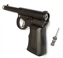 Loading is by a screw breech at the rear. The pellet is pushed far down the barrel by a long pin on this breech, until it is past the air port. If the breech pin is lost, the pistol cannot be loaded. A common replacement, given the nature of the pistol's users, was to replace the pin with another screw or other sort of extemporised plug. This does not work, the pellet in some cases even being fired backwards out of the breech.
