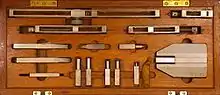 A gauge block is a block of metal or ceramic with two opposing faces ground precisely flat and parallel, a precise distance apart. Standard grade blocks are made of a hardened steel alloy, while calibration grade blocks are often made of tungsten carbide, chromium carbide or ceramic because they are harder and wear less.[2] Gauge blocks come in sets of blocks of various lengths, along with additional wear blocks, to allow a wide variety of standard lengths to be made up by stacking them. The length of each block is actually slightly shorter than the nominal length stamped on it, because the stamped length includes the length of one wring film, a film of lubricant which separates adjacent block faces in normal use. The thickness of the wring film is about 25 nanometers (0.98 μin).[3] The gauge's nominal length is also known as the interferometric length.[4]