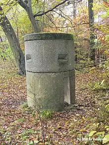 From the main entrance at the top of the Gallitzinberg hill, a blast-proofed staircase descended 25 meters to the main tunnel (profile, 2 x 2 meters) which ran for about 100 meters horizontally to the north, ending in a secondary entrance where a small power plant was situated. Another tunnel diverged eastward towards the 17 x 5 meter actual bunker core.[1] On its upper level were the communications facilities, with landlines to all civil emergency services, the Führer Headquarters, the Oberkommando der Luftwaffe and even the Kriegsmarine. On the lower level were the command center, a meeting room and Schirach's personal facilities. The tunnel system had a total length of 340 meters. A tripartite security zone system controlled access to the installation.