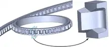 A gear bearing is a type of rolling-element bearing similar to an epicyclic gear. Gear bearings consist of a number of smaller 'satellite' gears which revolve around the center of the bearing along a track on the outsides of the internal and satellite gears, and on the inside of the external gear. Each gear is in between two concentric rings. Therefore, the widths of the satellite gears must all be the same.