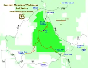 Gearhart Mountain Wilderness is a wilderness area located within the Fremont–Winema National Forest in Lake County and Klamath County in south-central Oregon. This area was established in 1943 as a Wild Area and designated as wilderness with the Wilderness Act of 1964. In 1984, an additional 4,144 acres (1,677 ha) were added for a total of 22,823 acres (9,236 ha). The wilderness is entirely within the Bly Ranger District.[1]