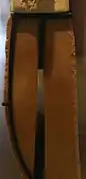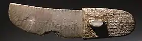 The handle is made of the ivory of an elephant tusk, and not from a hippopotamus canine tooth as was first thought.[1][16][17] The handle was carved along the axis of the tusk, as evidenced by a dark spot located above the head of the "Master of Animals", which is the tip of pulp cavity of the tusk.[1] Once extracted from the tusk, the handle was polished on both sides and hollowed out to receive the blade. The thickness of the handle around the tang of the blade varies from 2 to 3 millimetres (0.12 in), which explains that the ivory is cracked there, with some pieces lost. At the bottom of the handle, the edge was beveled, and probably received a crimp of precious metal that would have reinforced the assemblage of the handle with the blade. At the time of the purchase, Bénédite reported that he could see traces of gold leaf on the bottom of the handle, but this is now gone.[1] The assemblage supports the hypothesis that the knife was not functional: the tang of the blade is too short and the handle too thin for the knife to have been practical.[1]