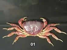 Gecarcoidea lalandii is a large species of terrestrial crab. It is dark purple in colour, with long legs and short pincers. It is nocturnal, so spends most of the day hiding in burrows. Compared to the related G. natalis, G. lalandii is relatively widespread, being found in the Indo-Pacific from the Andaman Islands and eastwards.[1] Adults mainly occur in forest, but can sometimes be found in more open habitats.[1] When carrying eggs, females migrate to the coast, where they release the eggs in the tidal zone.[1] Small adults sometimes fall prey to the crab Geograpsus crinipes.[1]