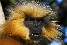 Gee's golden langur (Trachypithecus geei), also known as simply the golden langur, is an Old World monkey found in a small region of Western Assam, India and in the neighboring foothills of the Black Mountains of Bhutan. Long considered sacred by many Himalayan people, the golden langur was first brought to the attention of the western world by the naturalist Edward Pritchard Gee in the 1950s. Adult males have a cream to golden coat with darker flanks while the females and juveniles are lighter. It has a black face and a long tail up to 50 cm (19.69 in) in length. It lives in high trees and has a herbivorous diet of ripe and unripe fruits, mature and young leaves, seeds, buds and flowers. The average group size is eight individuals, with a ratio of several females to each adult male. It is one of the most endangered primate species of India and Bhutan.