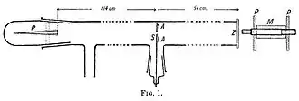 A 1908 paper by Geiger, On the Scattering of α-Particles by Matter,[16] describes the following experiment. He constructed a long glass tube, nearly two meters in length. At one end of the tube was a quantity of "radium emanation" (R) that served as a source of alpha particles. The opposite end of the tube was covered with a phosphorescent screen (Z). In the middle of the tube was a 0.9 mm-wide slit. The alpha particles from R passed through the slit and created a glowing patch of light on the screen. A microscope (M) was used to count the scintillations on the screen and measure their spread. Geiger pumped all the air out of the tube so that the alpha particles would be unobstructed, and they left a neat and tight image on the screen that corresponded to the shape of the slit. Geiger then allowed some air in the tube, and the glowing patch became more diffuse. Geiger then pumped out the air and placed some gold foil over the slit at AA. This too caused the patch of light on the screen to become more spread out. This experiment demonstrated that both air and solid matter could markedly scatter alpha particles. The apparatus, however, could only observe small angles of deflection. Rutherford wanted to know if the alpha particles were being scattered by even larger angles—perhaps larger than 90°.