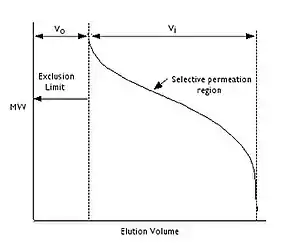 If an analyte is too large, it will not be retained; conversely, if the analyte is too small, it may be retained completely. Analytes that are not retained are eluted with the free volume outside of the particles (Vo), while analytes that are completely retained are eluted with volume of solvent held in the pores (Vi). The total volume can be considered by the following equation, where Vg is the volume of the polymer gel and Vt is the total volume:[3]