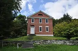 The Hall House is located in southern Wallingford, north of the village of South Wallingford, and a short way north of a point where the road and railroad are briefly in close proximity. The house is a 2+1⁄2-story brick structure, standing on the west side of the highway, with its front-facing gable oriented toward the road. The brick is laid in a combination of Flemish and common bond, with marble window sills and lintels, and marble stairs leading to the entrance. The entrance is set in the leftmost of three bays, in an arched opening with a louver above the door. A similar louver is found in the center of the fully pedimented gable.[2]