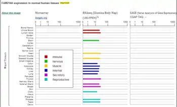 - Expression: The left column shows the resources of the data. Expression images and data, similar genes, PCR arrays, primers for human and in situ hybridization assays are included in this section.