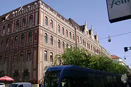 The project, created by the Hungarian architects Ernő Foerk and Gyula Sándy in the Hungarian Secession style, envisioned an 82-metre (269 ft) long two-story building made of weather-resistant red brick and stone, with three entrances.[1]