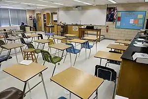 Many American public schools suffer from inadequate or dated facilities. Some schools even leak when it rains. It is 2017 report on American infrastructure, the American Society of Civil Engineers (ASCE) gave public schools a score of D+.[142] In 2013, less than a third of American public schools have access to broadband Internet service, according to the non-profit EducationSuperHighway. By 2019, however, that number reached 99%. This has increased the frequency of digital learning.[143]