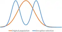 Disruptive selection is seen in the bimodal population of Darwin's finches, Geospiza fortis.[7] The two modes specialize in eating different types of seeds small and soft versus large and hard, this results in beaks of different sizes with different force capacities.[7] Individuals with intermediate beak sizes are selected against.[7] The song structure and response to song also differs between the two modes.[7] There is minimal gene flow between the two modes of G. fortis.[7]
