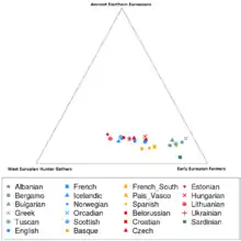 Recent studies of ancient DNA have revealed that European populations are largely descending from three ancestral groups. The first one are Paleolithic Siberians, the second one are Paleolithic European hunter-gatherers, and the third one are early farmers and later arrivals from the Near East and West Asia. According to this, Bulgarians are predominantly (52%) descending from early Neolithic farmers spreading the agriculture from Anatolia, and from West Asian Bronze Age invaders and cluster together with other Southern Europeans. Another of the admixture signals in that farmers involves some ancestry related to East Asians, with ~ 2% total Bulgarian ancestry proportion linking to a presence of nomadic groups in Europe, from the time of the Huns to that of the Ottomans. A third signal involves admixture between the North European group from one side and the West Asian - Early farmers' group from another side, at approximately the same time as the East Asian admixture, ca. 850 AD. This event may correspond to the expansion of Slavic language speaking people. The analysis documents the hunter-gatherer admixture in Bulgarians at a level from ca. 1/3.[77] The impact of Yamnaya culture is estimated at 20-30%, which is most common among the Slavs.