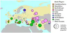 Computing the frequency of common point mutations of several mtDNA Thracian remains from Romania with haplogroups H17, H22 and HV has resulted that the Italian (7.9%), the Albanian (6.3%) and the Greek (5.8%) have shown a bias of closer genetic kinship with the Thracian individuals than the Romanian and Bulgarian individuals (4.2%), but it was noted that more mtDNA sequences from Thracian individuals are needed in order to perform a complex objective statistical analysis.[68] From seven Thracian samples aged about 3 millennia from Gabova Mogila and Shekerdja Mogila in Sliven Province, and from Bereketska Mogila in Stara Zagora Province, two were identified as belonging to mtDNA Haplogroup D, presumably associated with East Asia. Haplogroup W5a was found among two individuals and H1an2. H14b1 was also found.[69] Four samples from Iron Age Bulgaria were studied, the official study confirmed only that the two are male and mtDNA of two individuals - U3b for the Svilengrad man and HV for the Stambolovo individual. Haplogroups U for the Krushare man, U2e for the Vratitsa individual have been identified. Those individuals were from Thracian burial sites and are dated at around 450-1500 BC.[70]