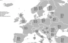 The national groups of Eastern Europe are characterized by dominant haplogroups R1a or I2, while those of Western Europe are characterized by dominant haplogroups R1b or I1, and by other dominant haplogroups in Europe are characterized Albanians, Finns, Greeks, and Turks, and over 50% of the total pool of each European nation other than the latter consists of these 4 haplogroups.[8] A consistent pattern of both all national and regional groups of Bulgarians and Balto-Slavs is that their sum of haplogroups R1a and I2 is always larger than their sum of R1b and I1, while this ratio is vice versa in the Europeans not native to the Post-Eastern Bloc.[8] Bulgarians, as some of their neighbours show the highest diversity of haplogroups in Europe, marked by significant (> 10%) frequencies of 5 major haplogroups. Most Bulgarians belong to three unrelated haplogroups, 20% of whom to I-M423 (I2a1b), 18% to E-V13 (E1b1b1a1b1a) and 17% to R-Z282 (R1a1ab1), but the biggest part belongs to macro-haplgoroup R (~28%). The major haplogroups, grouped by age of around 20 kya, are:[11]