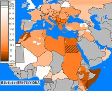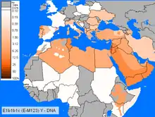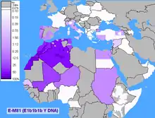 This haplogroup reaches a mean frequency of 85% in North Africa. It decreases in frequency from approximately 80% or more in some Moroccan Berber populations, including Saharawis, to approximately 28% to the east of this range in Egypt.[26][30][35]