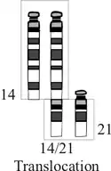 Translocation Down syndrome can be de novo; that is, not inherited but occurring at the time of an individual's conception, or may be inherited from a parent with a balanced translocation. The balanced translocation figure shows a 14/21 translocation between the long arms of chromosomes 14 and 21, where the other chromosomes are not shown. The individual has two copies of everything on chromosome 14, and two copies of all of the material on the long arm of chromosome 21 (21q). The derivative chromosome 21, which contains only heterochromatin, is lost; thus, the individual only has one copy of the material on the short arm of chromosome 21 (21p), but this appears to have no discernible effect. Individuals with this chromosomal arrangement have 45 chromosomes and are phenotypically normal. During meiosis, the chromosomal arrangement interferes with normal separation of chromosomes. Possible gametic arrangements are (see translocation karyotype figure):