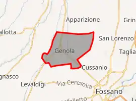 Genola is a comune (municipality) in the Province of Cuneo in the Italian region Piedmont, located about 50 km (31 mi) south of Turin and about 25 km (16 mi) northeast of Cuneo. As of 31 December 2004, it had a population of 2,380 and an area of 13.7 km2 (5.3 sq mi).[3]