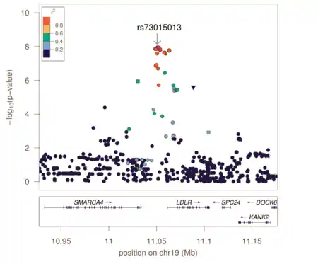 Regional association plot, showing individual SNPs in the LDL receptor region and their association to LDL-cholesterol levels. This type of plot is similar to the Manhattan plot in the lead section, but for a more limited section of the genome. The haploblock structure is visualized with colour scale and the association level is given by the left Y-axis. The dot representing the rs73015013 SNP (in the top-middle) has a high Y-axis location because this SNP explains some of the variation in LDL-cholesterol.[30]