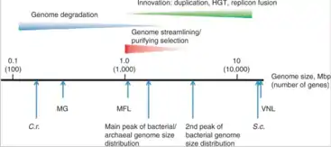 Genome evolution in bacteria is well understood because of the thousands of completely sequenced bacterial genomes available. Genetic changes may lead to both increases or decreases of genomic complexity due to adaptive genome streamlining and purifying selection.[6] In general, free-living bacteria have evolved larger genomes with more genes so they can adapt more easily to changing environmental conditions. By contrast, most parasitic bacteria have reduced genomes as their hosts supply many if not most nutrients, so that their genome does not need to encode for enzymes that produce these nutrients themselves.[7]