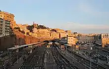 Genova Piazza Principe railway station (commonly called Genova Principe or incorrectly Genova Porta Principe) is the central station of Genoa and is located on Piazza Acquaverde, occupying the entire north side of Via Andrea Doria—where the station entrance is located—in the town centre and a short distance from the Palazzo del Principe, from which it takes its name. It is used by about 66,000 passengers per day and 24,000,000 per year. The first temporary station was opened in 1854 at the end of the line from Turin. Lines were later opened to Milan, Rome and the French border at Ventimiglia.
