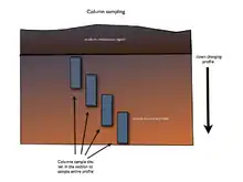 Column sampling is a technique of collecting samples from a section for analyzing and detecting the buried processes down the profile of the section. Narrow metal tins are hammered into the section in a series to collect the complete profile for study. If more than one tin is needed they are arranged offset and overlapping to one side so the complete profile can be rebuilt offsite in laboratory conditions.