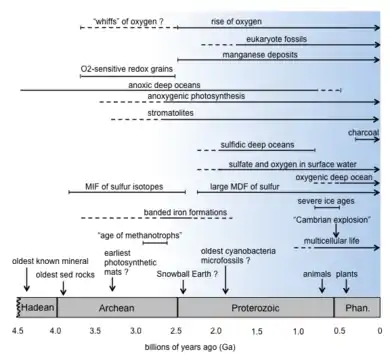 The presence of oxygen on Earth from its first production by cyanobacteria to the GOE and through today has drastically impacted the course of evolution of life and planet.[19] It may have triggered the formation of oxidized minerals[24] and the disappearance of oxidizable minerals like pyrite from ancient stream beds.[25] The presence of banded-iron formations (BIFs) have been interpreted as a clue for the rise of oxygen since small amounts of oxygen could have reacted with reduced ferrous iron (Fe(II)) in the oceans, resulting in the deposition of sediments containing Fe(III) oxide in places like Western Australia.[26] However, any oxidizing environment, including that provided by microbes such as the iron-oxidizing photoautotroph Rhodopseudomonas palustris,[27] can trigger iron oxide formation and thus BIF deposition.[28][29][30] Other mechanisms include oxidation by UV light.[31] Indeed, BIFs occur across large swaths of Earth's history and may not correlate with only one event.[30]