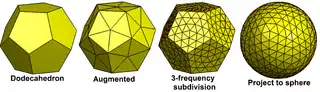 | Form | 3-frequency subdivided icosahedron | Kis truncated icosahedron | Geodesic polyhedron (3,0) | Spherical polyhedron |
