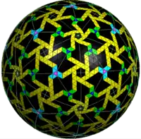 ![]() An artistic model created by Father Magnus Wenninger called Order in Chaos, representing a chiral subset of triangles of a 16-frequency icosahedral geodesic sphere, {3,5+}16,0 |