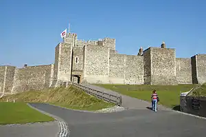 Geoffrey was consecrated on 18 August 1191,[35] at Tours in France, by Barthelemy de Vendôme, the Archbishop of Tours, after the papacy agreed to allow the consecration. This permission was secured by the intervention of the king and his mother, Eleanor of Aquitaine.[10] Turner and Heiser see the presumed motivation behind Eleanor and Richard's support as part of an effort to secure a counter-weight to the power exercised in England by the Chancellor, William Longchamp, about whom complaints had reached Richard in Sicily.[41] Geoffrey received his pallium, the symbol of an archbishop's authority, at his consecration.[4] In September 1191, after the consecration,[10] he attempted to go to York, but was met at Dover by agents of Longchamp, and even though he took refuge in the priory of St. Martin in Dover, was dragged from sanctuary and imprisoned in Dover Castle.[42] Longchamp claimed that Geoffrey had not sworn fealty to Richard, but this was probably just an excuse to eliminate a rival.[33] Another complication was that the English bishops had appealed to the papacy because Geoffrey had not been consecrated by the Archbishop of Canterbury, and Longchamp could therefore claim to have been acting on behalf of the other bishops in ordering Geoffrey's arrest.[10] But the actions of Longchamp's agents were considered excessive and there was soon an outcry against the Chancellor's arrest of Geoffrey, even though Longchamp claimed that his orders had been exceeded by his agents.[43] One cause of the outrage was the obvious parallel with the murder of Thomas Becket, who had been dragged from an altar and martyred.[44] The archbishop was released and took part in a council held at Loddon Bridge, between Reading and Windsor; Longchamp was excommunicated and deposed from the chancellorship,[45] and Hugh of Lincoln, the Bishop of Lincoln, excommunicated those who had dragged Geoffrey from sanctuary.[10] Geoffrey was then enthroned at York on 1 November 1191.[4]