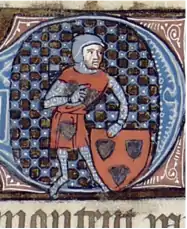 ![]() Geoffroi de Charny from a historiated initial in the manuscript of his works preserved in the Biblioteca Nacional, Madrid (Madrid MS. 9270, fol.98r) | |