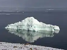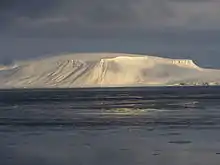Hall Island (Ostrov Gallya) is an almost completely glacierized large island of 1,049 km2 (405 sq mi) immediately to the east of MacKlintok Island. It lies within latitude 80.30° N and longitude 56.00° E. The highest point on the island is 502 m (1,647 ft) and its mapped shore length is 174.7 km (108.6 mi).[10][21] It was named after American Arctic explorer Charles Francis Hall. The only relatively large areas free of permanent ice are located in its southern end, where there are two headlands, Cape Tegethoff, and Cape Ozernyy, on the Littov Peninsula. Cape Tegethoff has a range of hill peaks.[7] The airborne surveys revealed 400 metres (1,300 ft) thick mantles of ice and also in Graham Bell Island's ice capes.[22] There is also a very small unglacierized area around its eastern cape, Cape Frankfurt, and another in its northwestern point, Cape Wiggins. Its highest point is 502 m (1,647 ft) near its southwestern side, and there is also a peak of 421 metres (1,381 ft) in the northcentral part of the island. There is a wide bay on the southeastern side of Hall Island known as Hydrographer Bay and a smaller one west of the Littov Peninsula, known as Bukhta Surovaya.[7] To the southeast, there is a wider strait separating Hall Island from Salm Island, known as Proliv Lavroka. The strait to the east is known as Avstriskiy Proliv.[21]