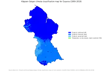 Lying near the equator, Guyana has a tropical climate, and temperatures do not vary much throughout the year.[1] The year has two wet seasons, from December to early February and from late April to mid-August.[3]