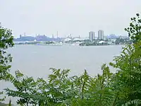 Burlington Bay is a natural harbour with a large sandbar called the Beachstrip. The first aboriginals to settle in the Hamilton area called this bay Macassa, meaning "beautiful waters".[3] This sandbar was deposited during a period of higher lake levels during the last ice age, and extends southeast through the central lower city to the escarpment. Hamilton's deep sea port is accessed by ship canal through the beach strip into the harbour and is traversed by two bridges, the QEW's Burlington Bay - James N. Allan Skyway and the lower Canal Lift Bridge. Hamilton Harbour ranks one of Canada's largest seaports. The Hamilton Port Authority manages the heavily industrial harbour.[14]