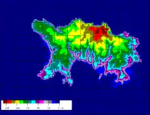Jersey is facing localised impacts due to anthropogenic climate change. The island is party to the Kyoto Protocol but does not have an emissions cap.[8] In 2017, Jersey has emissions of around 400 ktCO2 eq., a decrease of around 350 ktCO2 eq since the peak in 1998.[9] Under a 3 °C rise in temperature, Jersey may have four to five times the number of hot days in summer and a 45% decrease in summer rainfall.