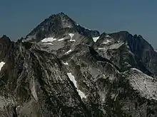 [4] Many tall waterfalls occur where meltwater from mountain glaciers drop down a headwall, which are common occurrences in the North Cascades. Many waterfalls, despite their great height, are non-notable as they are not clearly visible and often have low volume. Seahpo Peak Falls, despite its great height at nearly 2,200 feet (670 m), is an example of one of these waterfalls. A few notable exceptions do occur; Sulphide Creek Falls occurs where meltwaters from two of the largest Mount Shuksan glaciers are forced through a narrow chute over a 2,183-foot (665 m) headwall at the head of Sulphide Valley.