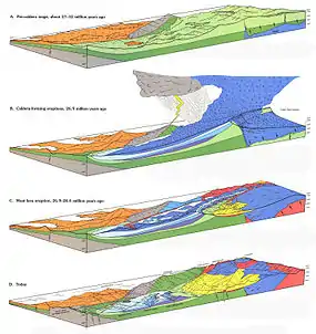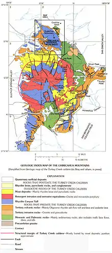 The Geologic history of the Chiricahua Mountains concerns the Chiricahua Mountains, an inactive volcanic range located in Coronado National Forest of southeastern Arizona, in the United States. They are part of an "archipelago" of mountain ranges known as the sky islands that connect the Sierra Madre Occidental in Mexico with the Rocky Mountains.[1] The Chiricahua Mountains are home to a number of unusual geologic features associated with the Turkey Creek Caldera, some of which are protected by Chiricahua National Monument. The landscape has been dominantly shaped by faulting due to Basin and Range extension during the Miocene, volcanic activity, and erosion.