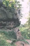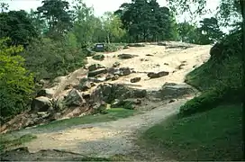 Now the Wilmslow Formation (part of the Sherwood Sandstone Group), the lower Triassic was previously a threefold division, the Lower Mottled Sandstone, The Pebble Beds and the Upper Mottled Sandstone (only the later is seen at Alderley), which merged into the Conglomerates of the upper Triassic. The Upper Mottled Sandstone – now the lower Wilmslow Member – is a medium- to coarse-grained friable false-bedded sandstone with abrupt colour changes from bright red to white. It is composed mainly of rounded grains but sub-angular grains also occur. Normally the rock lacks coherence and weathers into sand down to 6 m and even unweathered rock can be crushed to sand easily. However, near faults, ghost crystals of baryte make the sandstone harder and resistant.