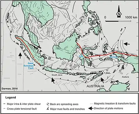 The tectonics processes in Indonesia formed major structures in Indonesia. The most prominent fault in the west of Indonesia is the Semangko Fault or the Great Sumatran Fault, a dextral strike-slip fault along Sumatra Island (about 1,900 km). The formation of this fault zone is related to the subduction zone in the west of Sumatra.
