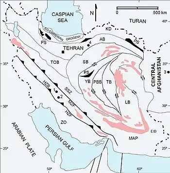 Considering geological and structural units of Iran, three main structural units or zones could be distinguished in Iran. These units or zones are separated from each other by ophiolite–bearing sutures. Other criteria such as structural style, crustal character and age of basement consolidation, age and intensity of deformation, age and nature of magmatism, are used to subdivide these major zones into smaller elements. The three major units and their main constituents could be defined as the southern, central and northern units.[1] The southern unit has a crystalline basement consolidated in the Precambrian time and a platform–type Paleozoic development and comprises the Zagros folded belt, southern and southwestern parts of the Zagros. This section made a part of the Arabian Plate that was located on the margin of Rodinia and Pannotia in the Neoproterozoic, and of Gondwana in the Paleozoic and Mesozoic. The central unit, which comprises the central Iran and the Alborz, is interpreted as an assemblage of fragments that were in the vicinity of the Arabian Plate and formed a marginal section of Rodinia and Pannotia in the Neoproterozoic and of Gondwana in the Cambrian, Ordovician, Silurian and Devonian. These fragments were detached from Gondwana in the Carboniferous. They were submerged, moved northwards, and were finally attached to the Eurasian section of the northern supercontinent Laurasia in the Late Triassic. These fragments or microplates were fused together and made the Iranian Plate which was rejoined by Gondwanic Afro-Arabia in the Late Cretaceous. As Afro-Arabia moved northwards towards Eurasia, the Arabian Plate ultimately collided with the Iranian Plate in the Miocene.[2] Finally there is the northern unit which is separated from the central unit by the North Iran Suture. It is characterized by continental crust including remnants of more or less cratonized former Paleozoic oceanic crust that seems to reflect the Paleotethys. The northern unit represents a marginal strip of the Hercynian realm of Central Asia- broadly overlapped by the Alpine realm. It was deformed and largely consolidated by the Early Cimmerian folding and the Late Alpine folding. The northern unit comprises the South Caspian Depression and the Kopet Dagh Range. These three main structural units are divided into some smaller geological and structural subdivisions which include the following zones: