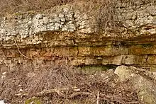 Permian rocks are also confined to the southwest, with a significant disconformity from underlying Carboniferous rocks. Permian rocks from the Kazanian are 35 meters thick with carbonate shale, dolomite, limestone and sandstone.[3]